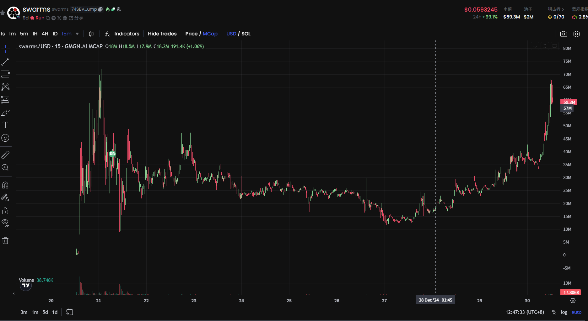 Swarms 代币在 12 月 18 日发币后,21 日迅速冲到了市值的最高峰 7420 万美元,可惜好景不长,市值像坐过山车一样跌到了谷底,仅剩约 600 万美元左右。