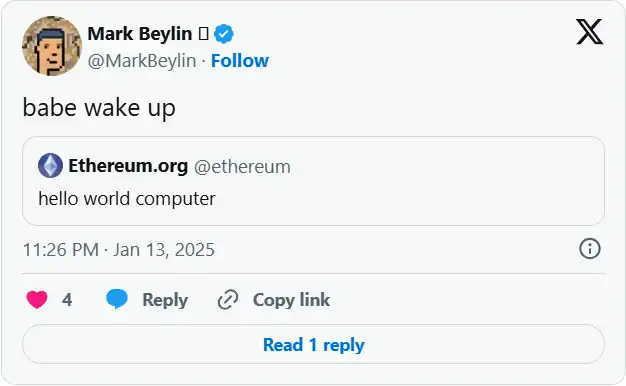 在周一早些时候,以太坊基金会不仅推出了新的 X 平台账号 Ethereum Foundation,同时还通过较少发布原创内容的 Ethereum.org 账号发布了「helloworldcomputer」的推文。根据官方公告: