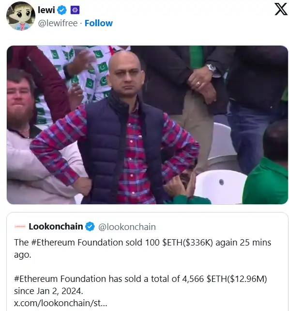 与此同时,链上数据显示,EF 于 1 月 8 日出售了 100ETH,价值约 33.6 万美元。自 1 月 2 日以来,基金会累计出售了近 1300 万美元的 ETH。社区成员对基金会此举表达不满,认为其在出售 ETH 的同时未能有效利用社交媒体宣传生态创新。