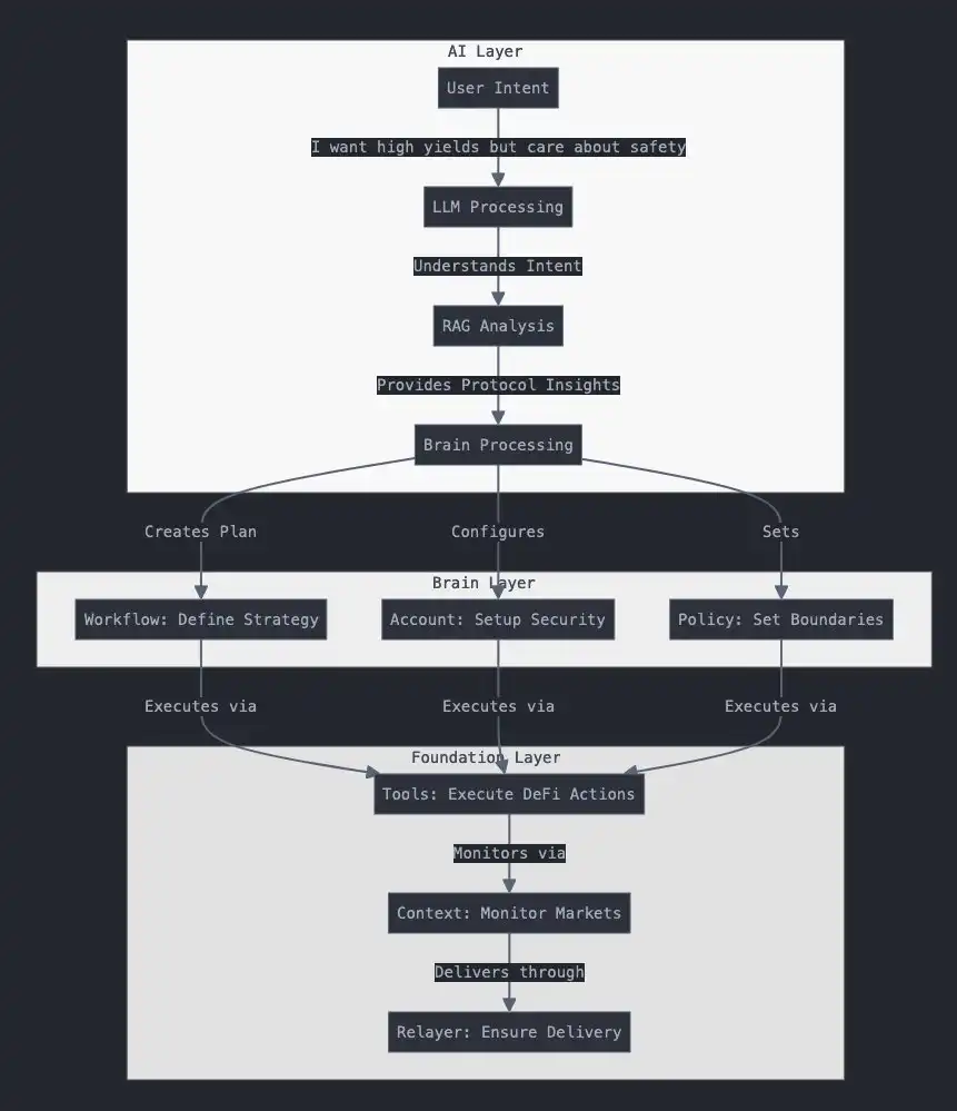 用户可以无缝与基于 ConsoleKit 构建的专用 agent 交互,只需一次点击即可部署资金或配置工作流,同时通过 safe 保留对资产的完全所有权。链上执行的复杂性——例如多链交易、实时决策或协议集成——被抽象化,用户得以使用简单而强大的工具来驾驭 DeFi。agent 作为可信的执行者,严格按照指令操作,无需接管资产托管权。