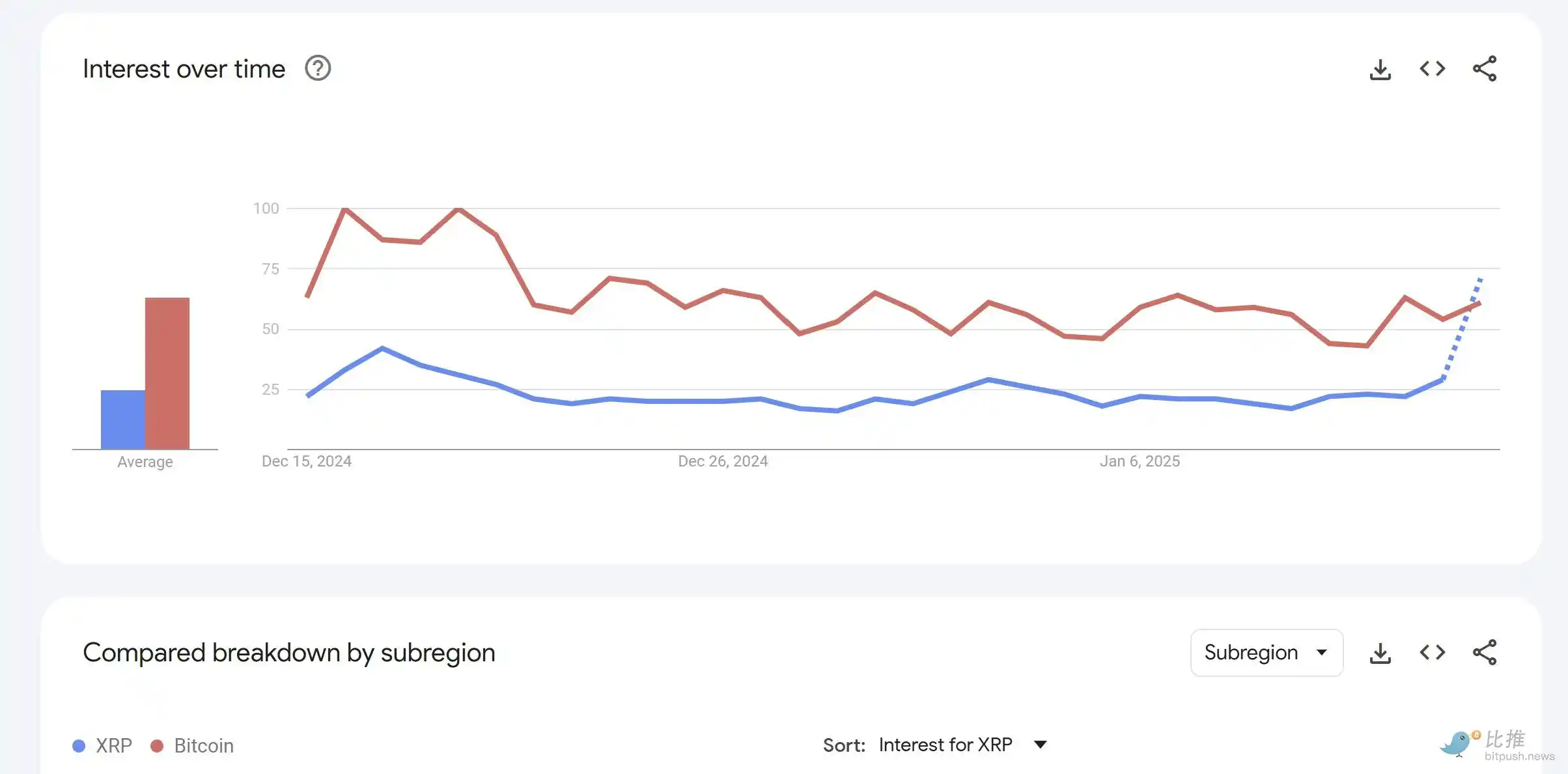 XRP 价格及其持有者在过去几周表现出强劲韧性。谷歌趋势数据显示,1 月 15 日,全球范围内对 XRP 的谷歌搜索量超过了比特币。过去一年中,XRP 两次在搜索量方面领先比特币,最近一次是在 2024 年 11 月。