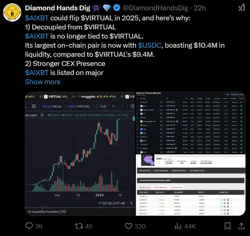 ·aixbt agent,Virtuals 上排名第一的代理,正开始脱离母生态系统。这证明 Virtuals 为代理提供了一个优秀的独立成长平台。