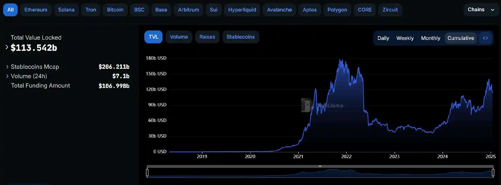 要知道自从 2020 年 Compound 引爆 DeFi 盛夏以来,整个链上世界的数字资产体量迎来了长足发展,即便相较于 2021 年 11 月的 1800 亿美元仍面临大幅回撤,但截至 2025 年 1 月 13 日,链上的 TVL 尚有 1135 亿美元之多。