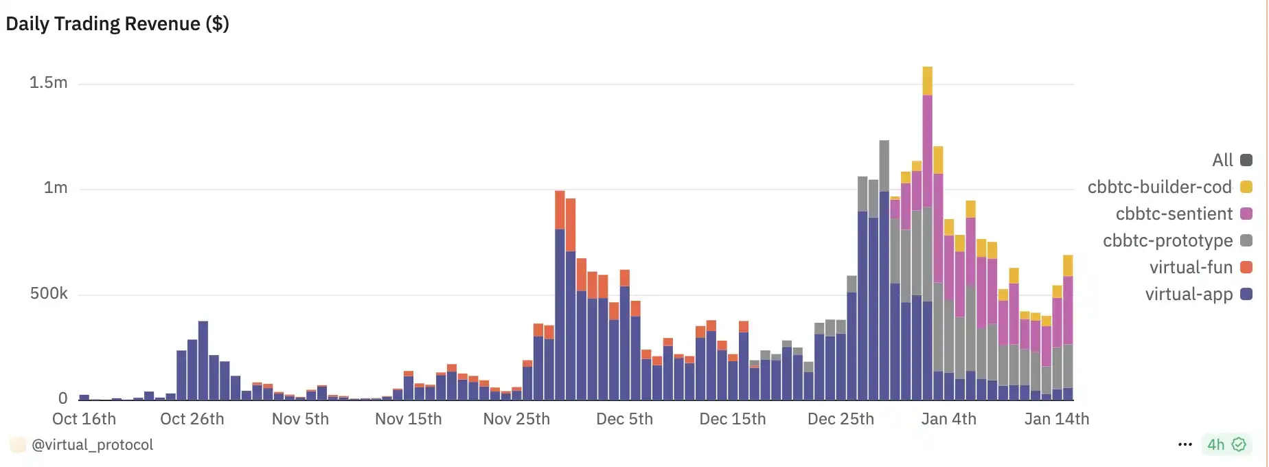 此外,Virtuals Protocol 的生态和业务数据也表现颇佳。Dune 数据显示,截至 1 月 16 日,Virtuals Protocol 已上线了超 1.6 万个代理,累计收入超 7505 万美元。