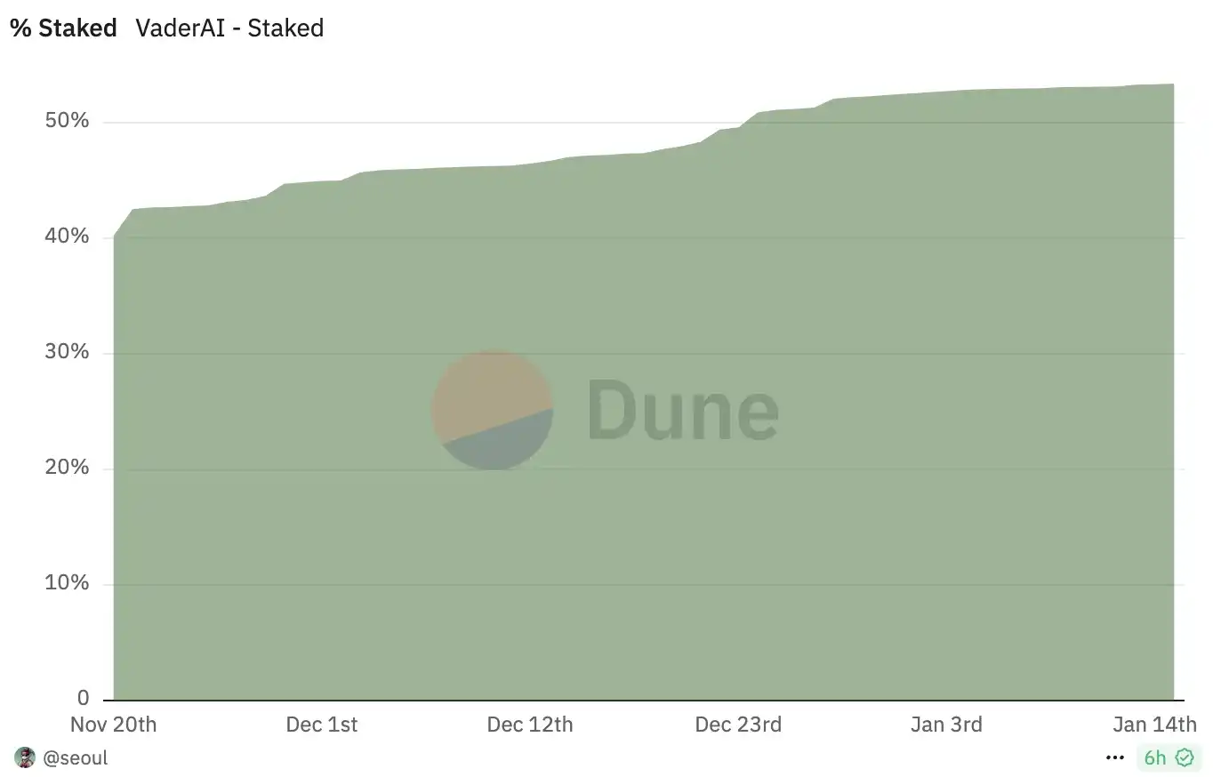 不久前,VaderAI 已被列入 Binance Alpha 名单。而据 Dune 数据显示,VADER 代币供应量的近 53.4% 已被质押,持有者数量在过去 30 天增长了 585.1% ,投资 DAO Small Cap 和 Micro Cap 基金的资产管理规模(AUM)总和超 79.8 万美元。