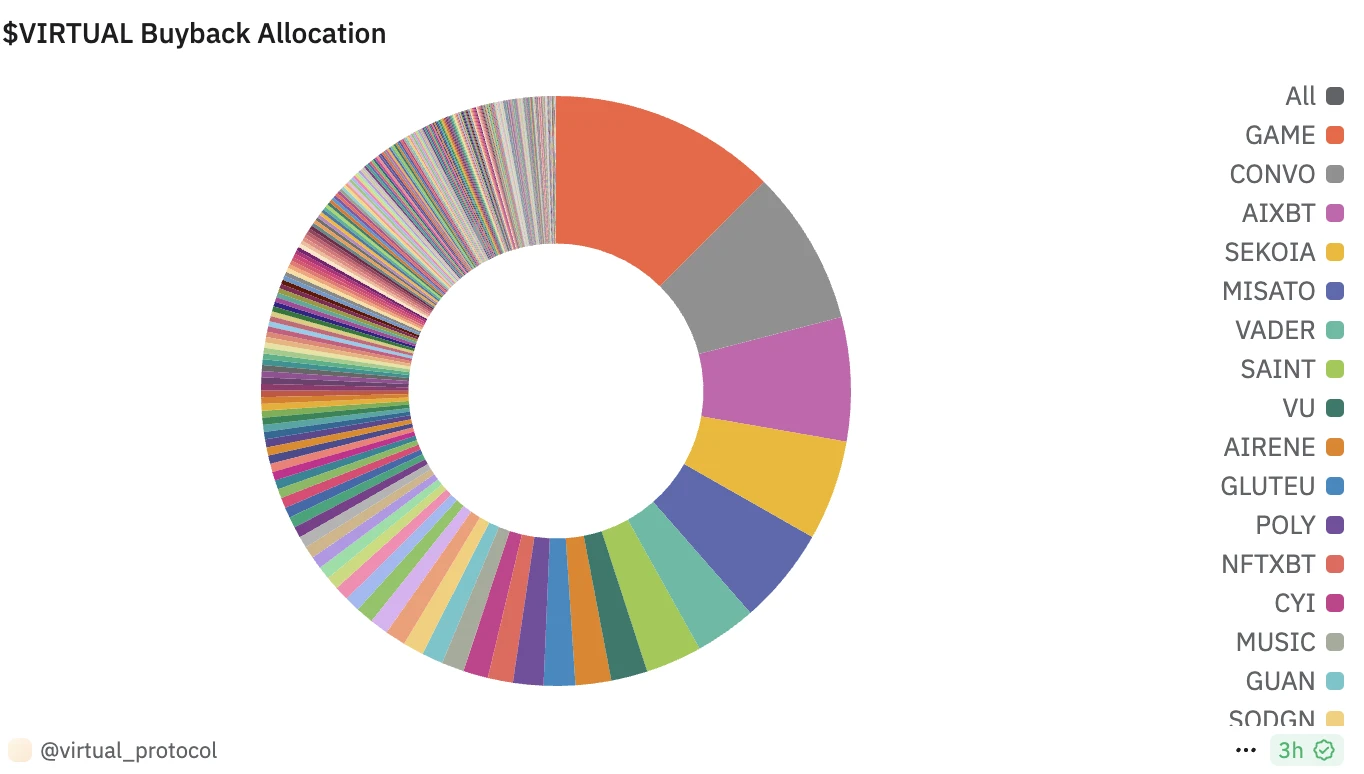 而在近期,Virtuals Protocol 也也频传利好消息。1 月 15 日,Virtuals Protocol 宣布更新价值累积机制,以更好地支持 Virtuals 生态系统建设者。该协议表示,自 2024 年 10 月 16 日以来,其已通过 post bonding 交易收入累计获得 12990427.85 枚 VIRTUAL(价值约 4000 万美元)。这将用于通过 30 天的时间加权平均价格(TWAP)回购并销毁相应的代理代币。其中, 30% 分配给代理创建者, 20% 分给代理关联方, 50% 给代理子 DAO,用于未来的治理决策。创作者的奖励将直接发送到代理部署者钱包。此外,Virtuals 还将引入代理合作伙伴机制,以协调交易平台/界面(例如 TG 机器人)与 Virtuals 生态系统之间的激励。当这些平台成为代理合作伙伴时,它们将获得其促成交易中 20% 的 Post-bonding 交易税——这些资金可用于奖励其社区或其他倡议。