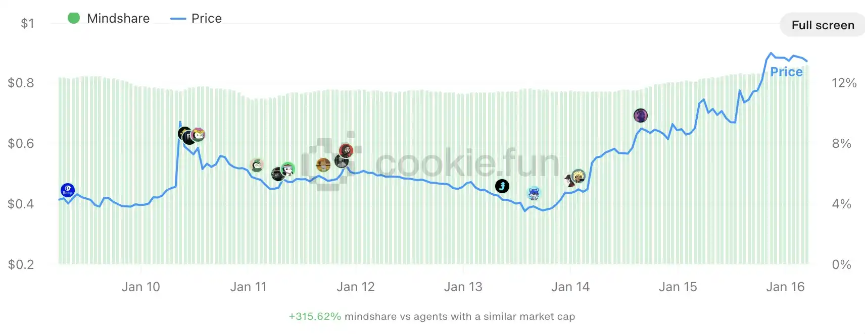 而在过去一段时间,AIXBT 在接连上线币安和 OKX 等主流交易所的同时,持续攻占用户心智。cookie.fun 数据显示,截至 1 月 16 日,AIXBT 的粉丝数超 38.9 万,心智占有率(Mindshare)近 13.2% 。这一趋势与 AIXBT 高胜率的代币推荐有着重要关系。CryptoHunt 数据显示,过去 30 天,AIXBT 的代币推荐胜率高达 72.4% ,最大收益率项目包括 PIPPIN、COOKIE 和 ANON 等。