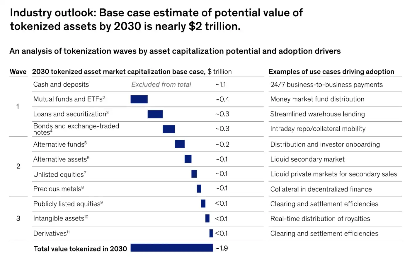 根据麦肯锡的分析,预计到 2030 年,各类代币化资产(不包括加密货币和稳定币)的市场总市值将达到约 2 万亿美元,悲观情况下为 1 万亿美元,乐观情况下可达 4 万亿美元。这些估算不包括稳定币(包括代币化存款、批发稳定币和中央银行数字货币 CBDCs),以避免重复计算,因为这些工具通常在代币化资产交易结算中用作现金支付工具。