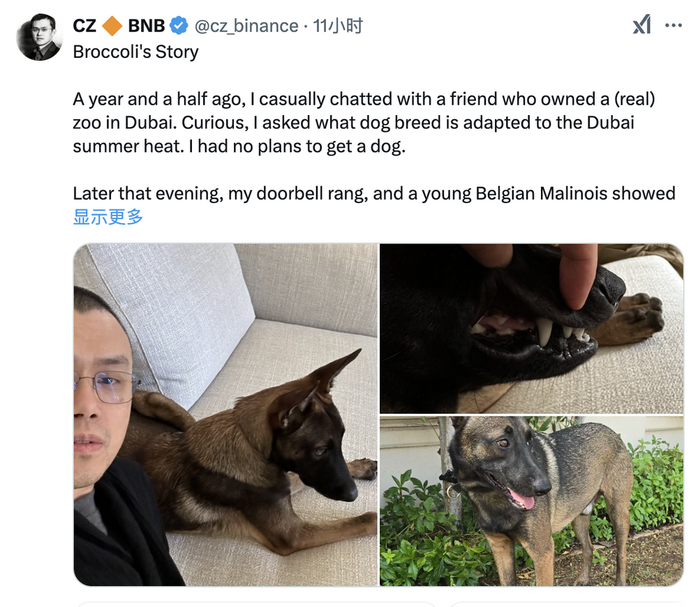 随后,全网开始竞猜 CZ 宠物狗的名字并开始埋伏相关 MEME 币企图早早「占座」,甚至有少数代币市值被推高数千甚至上亿美元。而在当天晚上,CZ 预告将在 3 小时后(迪拜时间晚上 8 点左右)发布狗狗的照片,吊足了 MEME 玩家的胃口。在经过数小时等待后,CZ 终于在公布 2 月 14 日凌晨公布了宠物狗 Broccoli 的照片以及他们之间的故事,且他还表示,「我只是发布了我狗的照片和名字。我不会亲自发行 Meme 币。这取决于社区是否这样做。BNB 基金会可能会为 BNB Chain 上的顶级 MEME 提供奖励,给予 LP 支持或其他奖励。细节仍在讨论中。更多内容即将发布。」