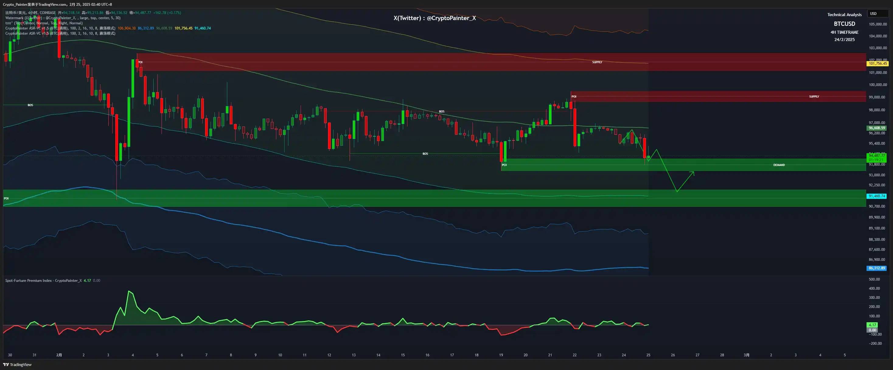此外,当前价格已接近震荡通道的下限 91400(青色线),且 K 线未出现长针,短期反弹力度将决定接下来的走势。青色线与核心需求区重合,理论上提供了短期支撑。然而,由于通道即将下行并可能拐头,长期走势仍偏向空头,这也提示市场可能面临进一步的下行压力。