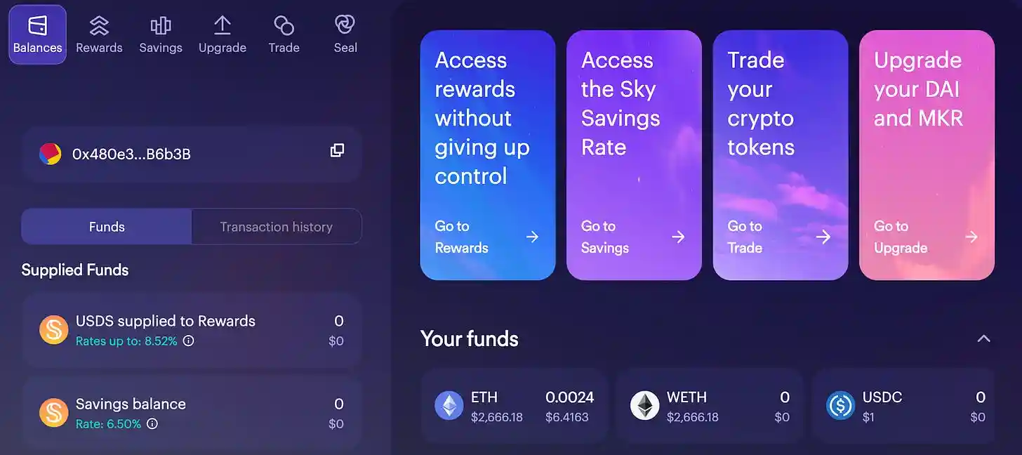 · 存入奖励金库 (Rewards Vault) 可获得 8.52% 的收益,以 SKY 形式支付。