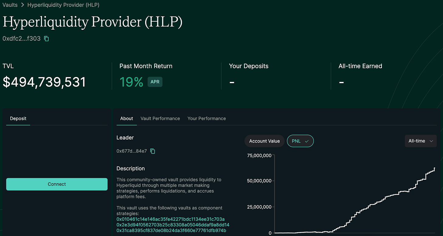 目前,Hyperliquid 平台的 Hyperliquidity Provider (HLP) 金库提供 18.61% 的收益率,是一个持续稳定的回报来源。根据官方描述,HLP 通过多种做市策略为 Hyperliquid 提供流动性,同时执行清算操作并积累平台交易费用。