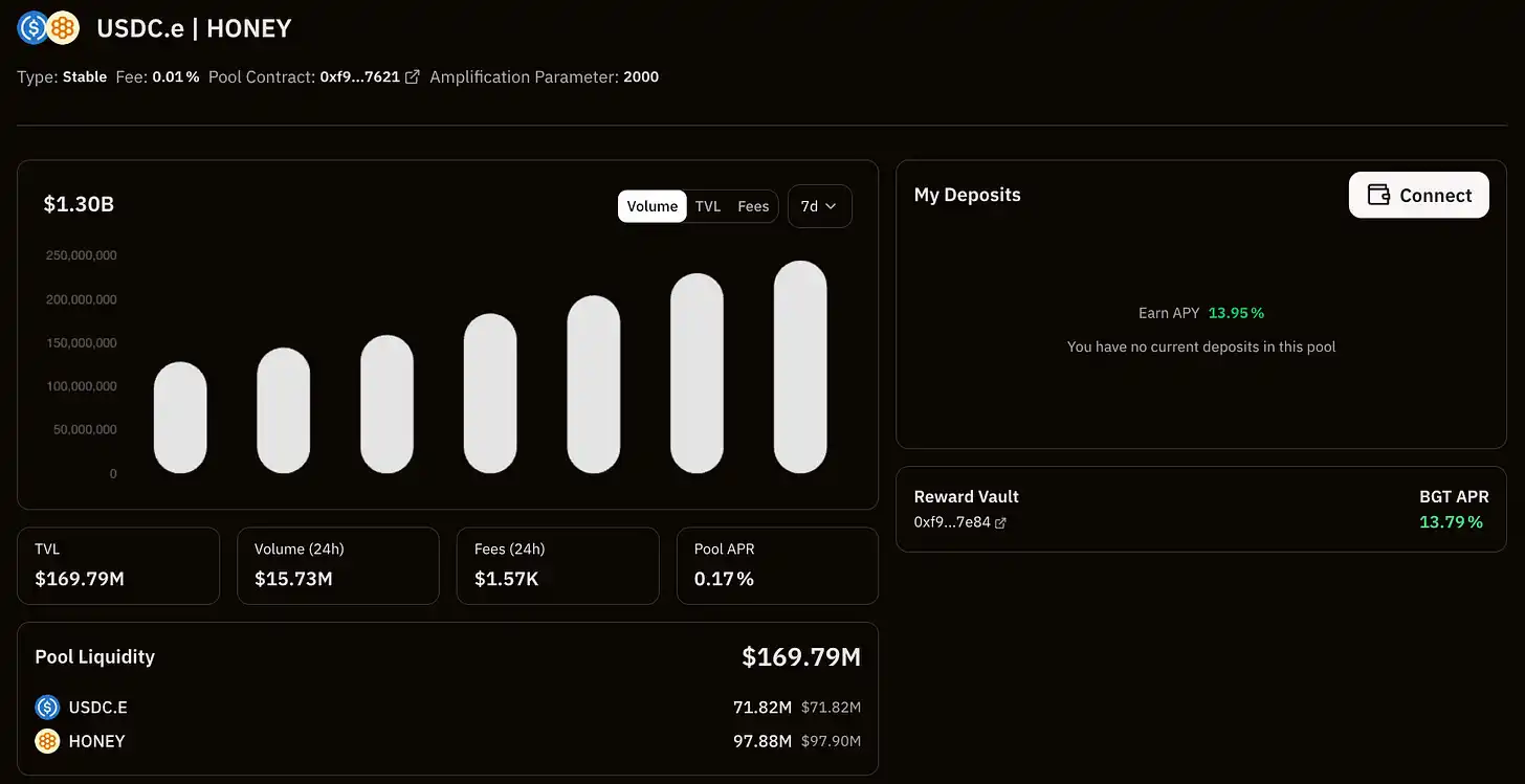 Berachain 原生 DEX 提供了一些有趣的机会,例如 USDC.e/HONEY 资金池,目前支付 13.79% 的收益率,形式为 BGT。BGT 是一种灵魂绑定代币(不可转让),但可以按 1:1 的比例燃烧兑换为 BERA。挖矿者可以选择立即出售以实现当前的 APR,或者积累 BGT,押注 Berachain 生态系统的未来发展(最近该生态系统正逐渐升温)。