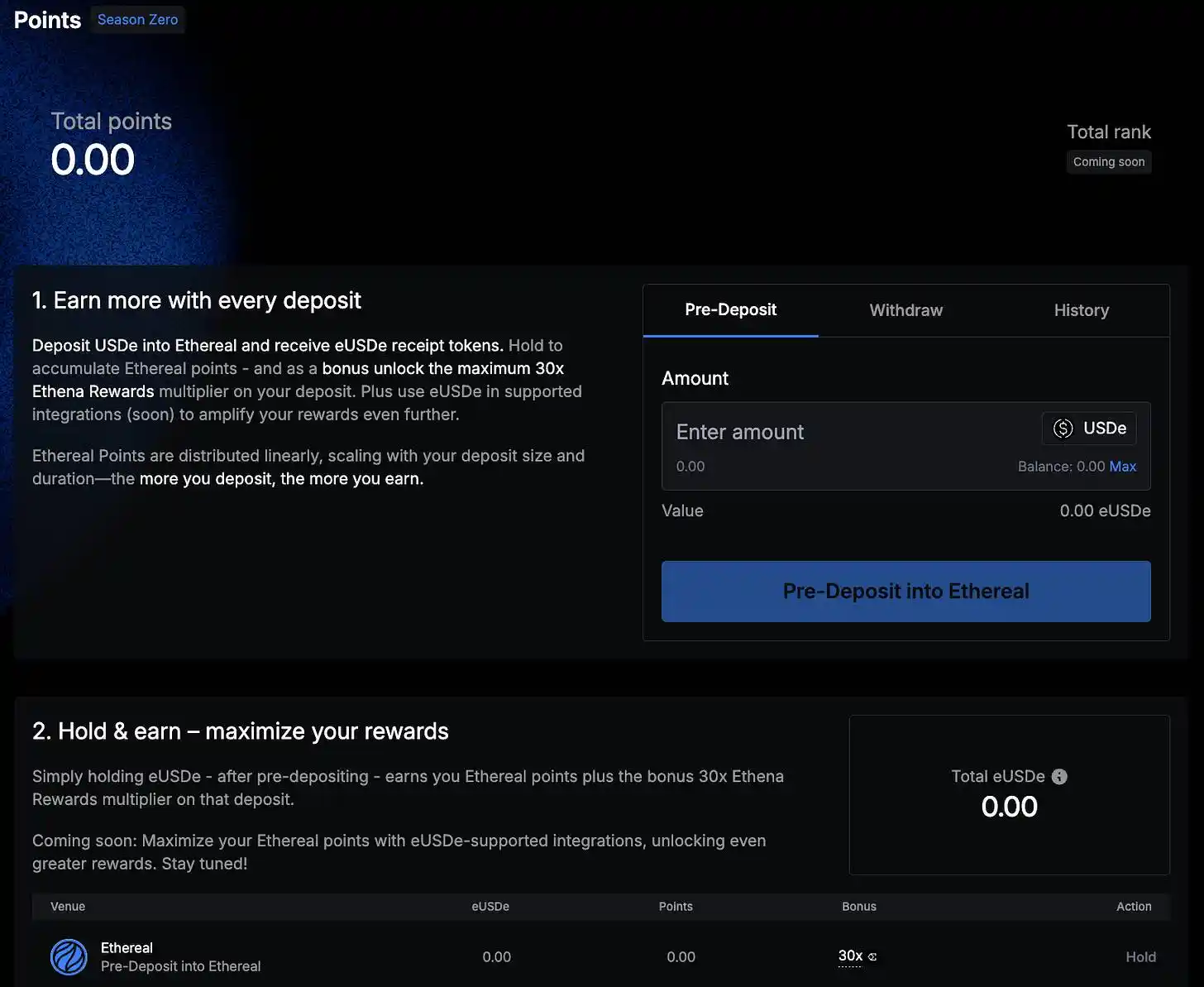 目前,Ethereal 正在开展一项名为「Season Zero」的积分活动,存入 USDe 的用户可以积累 Ethereal 积分,并获得 30 倍的 Ethena 奖励(具体基准尚不清楚,但可以假设部分 $ENA 代币将奖励给存款者)。