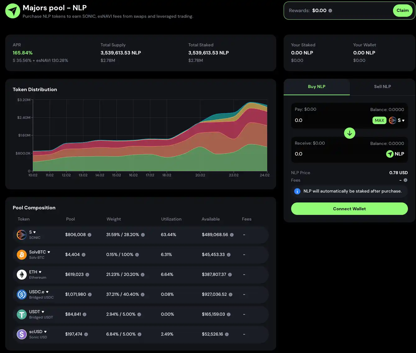 Navigator Exchange 是一个基于 GMX 的分叉项目,同时推出了一种类似 GLP/JLP 的产品,称为 NLP。这种产品需要注意的是,由于其投资组合中包含 S、BTC 和 ETH,因此可能面临一定的价格波动风险(Delta 风险)。目前,NLP 提供的回报率如下: