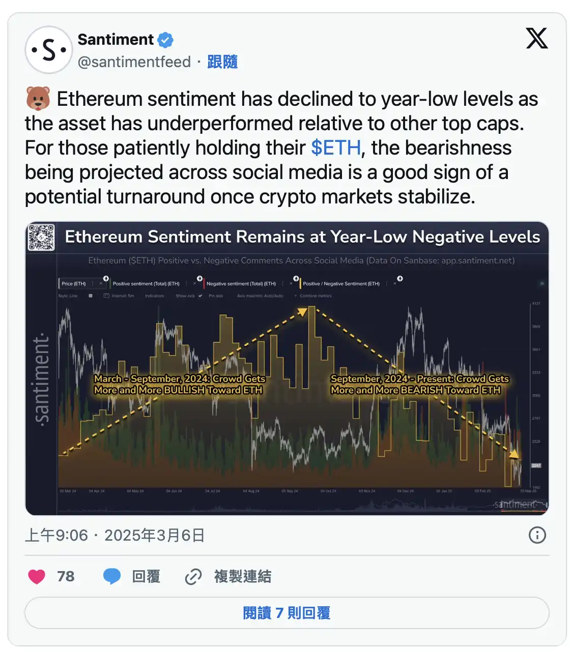 当前社群弥漫的悲观情绪,反而可能是市场触底回升的前兆。一旦加密市场趋于稳定,ETH 或有机会迎来反弹。