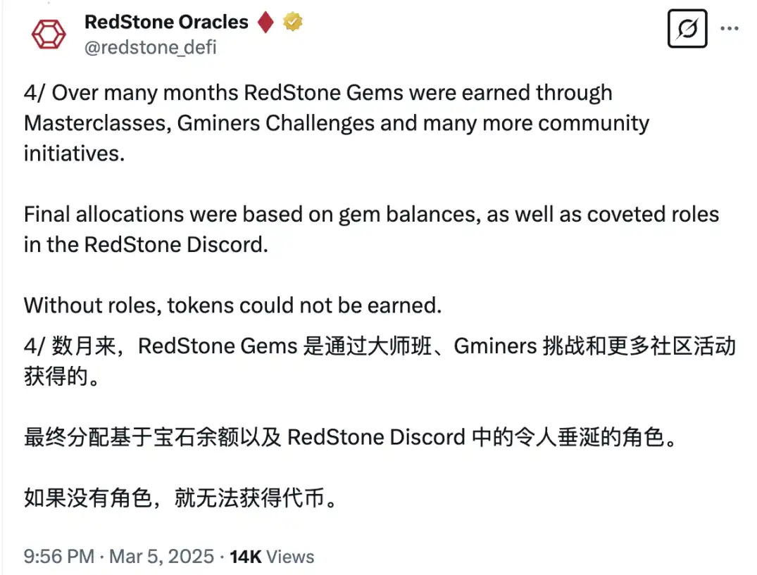 只要在 RedStone Discord 中没有特定角色,就无法获得代币!符合资格的角色包括 Vein Master、Deep Miner、Professor、IRL(参与过线下活动)等,而 RedStone Discord 近 23 万社区成员中拥有以上任一角色的比例不足 2%!