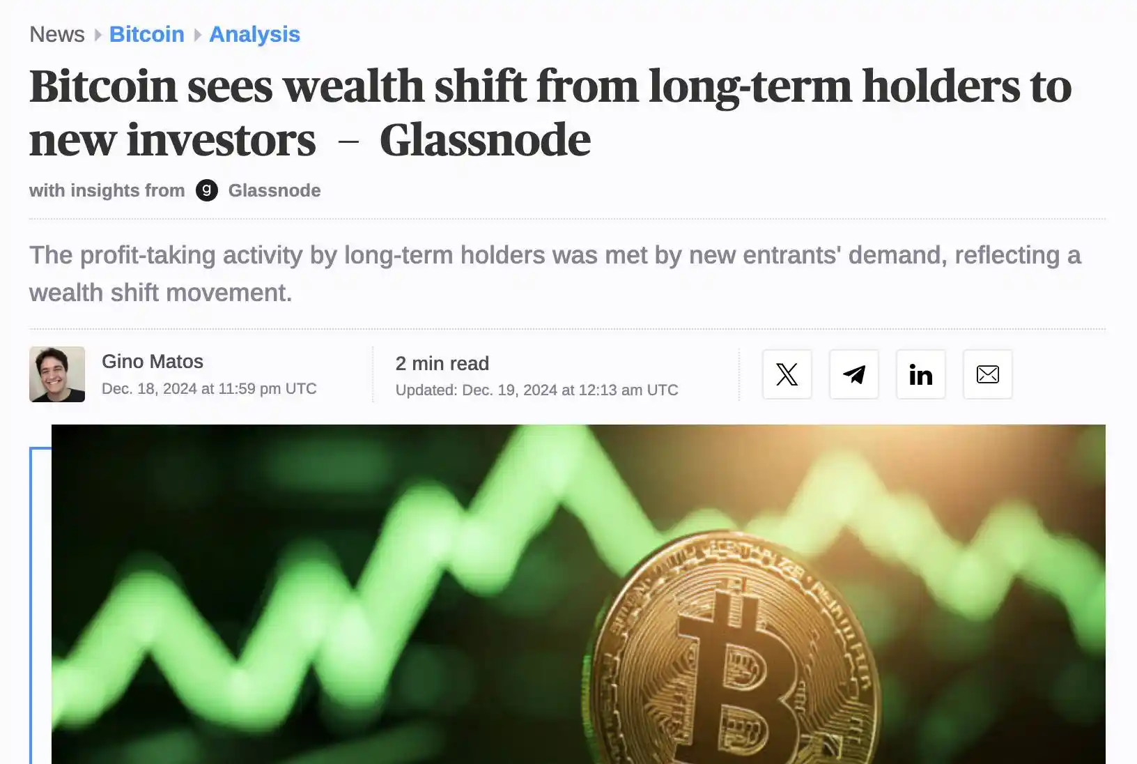 Glassnode 报告指出,大量财富已经或正在从长期持有者向新投资者转移,这是比特币市场走向成熟的标志——长线持有者实现了创纪录的利润(单日高达 21 亿美元),而新投资者具备足够的需求承接了这些抛盘,详见 Bitcoin sees wealth shift from long-term holders to new investors – Glassnode。