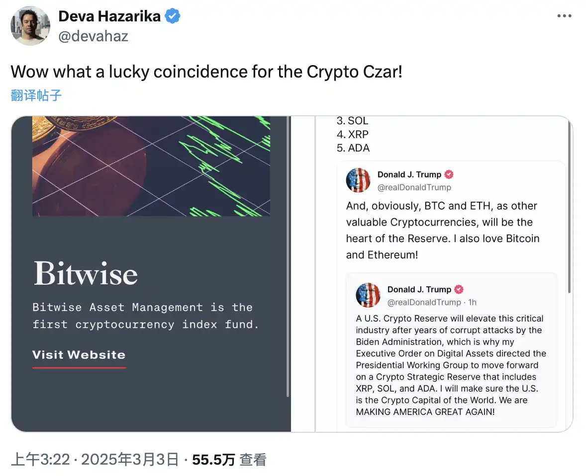 直接导火索是特朗普列出的加密货币储备资产与 Bitwise 的资产组合高度一致。而 David Sacks 的风险投资公司 Craft Ventures,早在 2017 年就投资了 Bitwise 的种子轮,与 Bitwise 颇有渊源。Bitwise 的加密货币指数基金持有大量 BTC、ETH、SOL、XRP 和 ADA——而这五种资产好巧不巧,正是特朗普「喊单」计划纳入储备的加密货币。批评者反讽 Bitwise 的投资组合对 David Sacks 来说「真是个幸运的巧合」,如果政府购买特朗普提议的战略储备资产(如 BTC、ETH 等),Bitwise 自然可能从中受益。