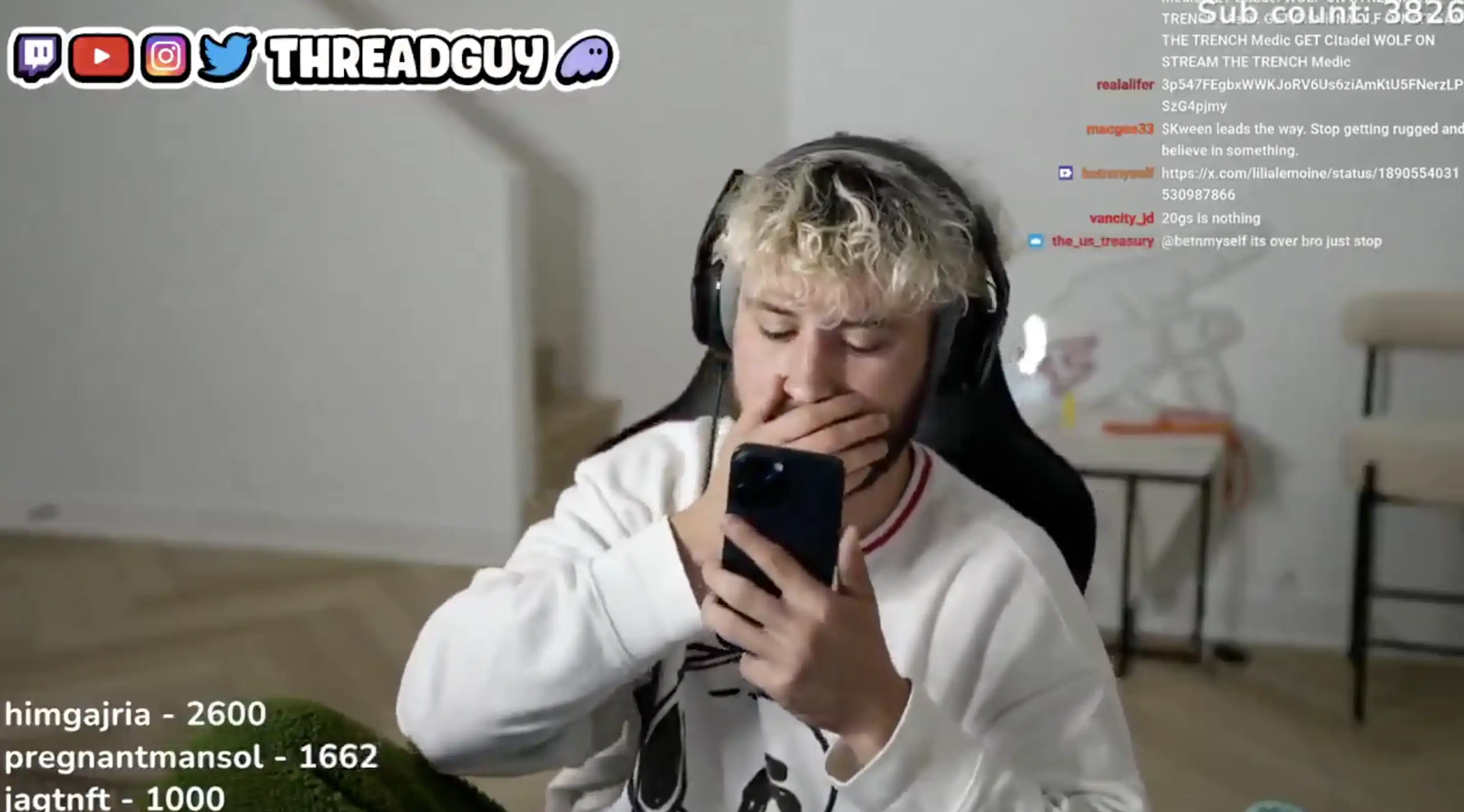 这期直播视频在 Twitch 上已经被删除,关于这天的直播,网络上流传最广的是一段 threadguy 把直播静音并且捂嘴接电话的切片,也正是因为这个举动,让他成为阿根廷总统「Libragate」事件的众矢之的。