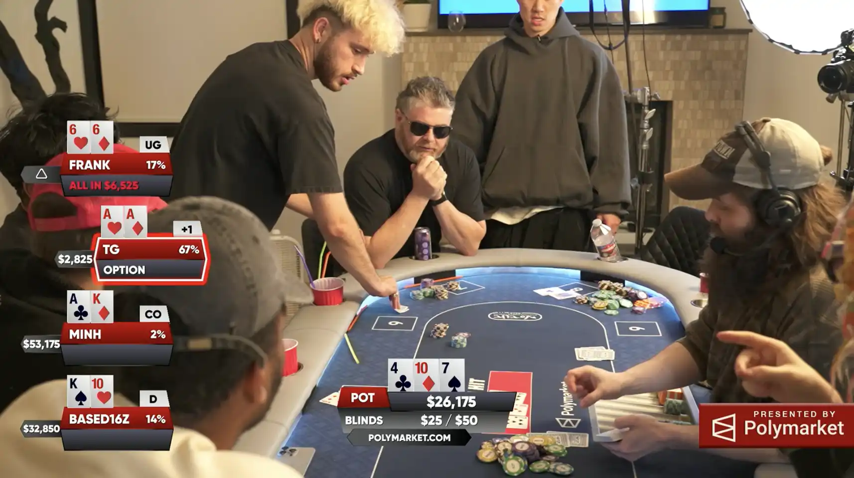 这场活动邀请了一众加密 KOL,有 Ansem、Macdegods、Frankdegods、Based16z、Rasmr、Bitboy 和 Minh,牌局持续了 7 个小时,比赛过程中还伴随着让观众在 Polymarket 下赌注,发推特互动。