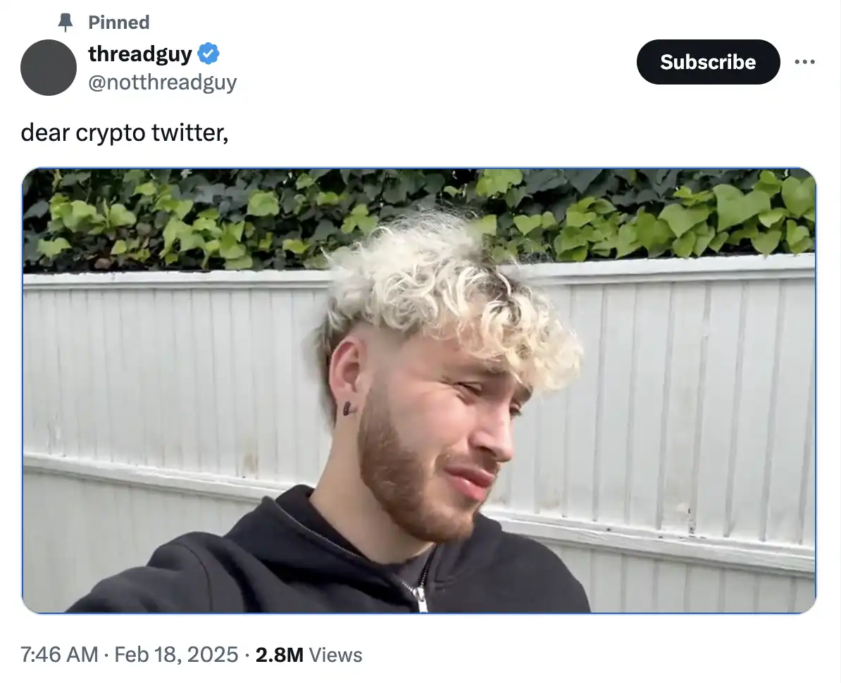 文章写完的这天,threadguy 在风波后第一次发帖,回复了一条去年 11 月的推文,「加密货币是当今世界最激动人心且发展最迅猛的行业,没有其他领域能望其项背,所有人都想入场,却无人真正理解,而在其他任何领域,KOL 都无法像在加密货币领域这样直接为社区成员创造财富。」
