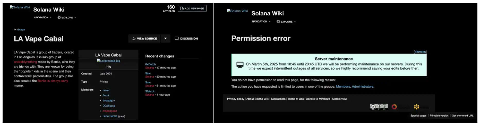 左:网页恢复后的 Solana Wiki 页面;右:Solana Wiki 删除页面;