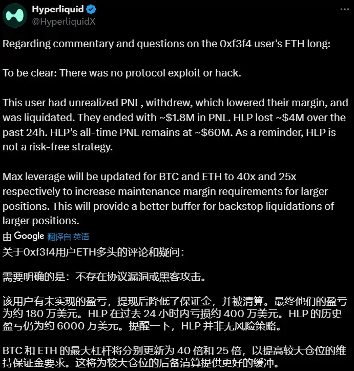 在爆仓发生后不久,Hyperliquid 就发文,称将 BTC 和 ETH 的最大杠杆将分别更新为 40 倍和 25 倍,以提高较大仓位的维持保证金要求,以为较大仓位的后备清算提供更好的缓冲。