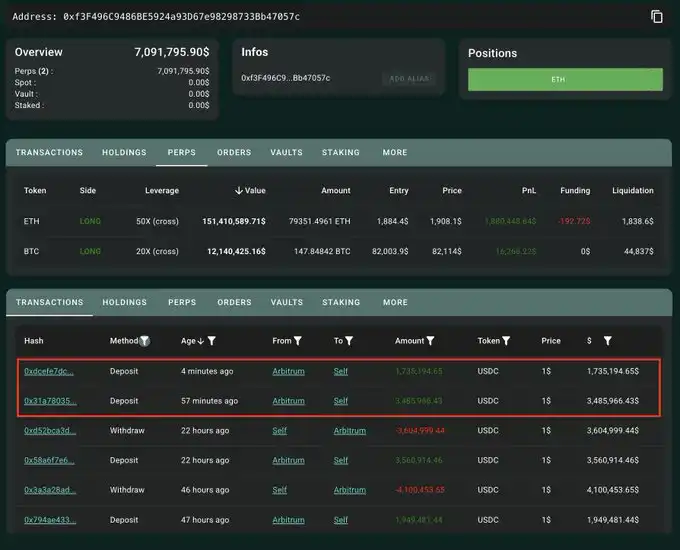 3 月 12 日下午,「内幕哥」(地址:0xf3f496c9486be5924a93d67e98298733bb47057c)向 Hyperliquid 存入 522 万美元,并以 50 倍杠杆分别在 1,884.4 美元(清算价格 1,838.2 美元)和 82,003.9 美元(清算价格 61,182 美元)位置开多 ETH 和 BTC。在此前 2 天里,这位内幕哥就以 100% 的胜率进行了两次 ETH 超短期做多操作,净赚 220 万美元。