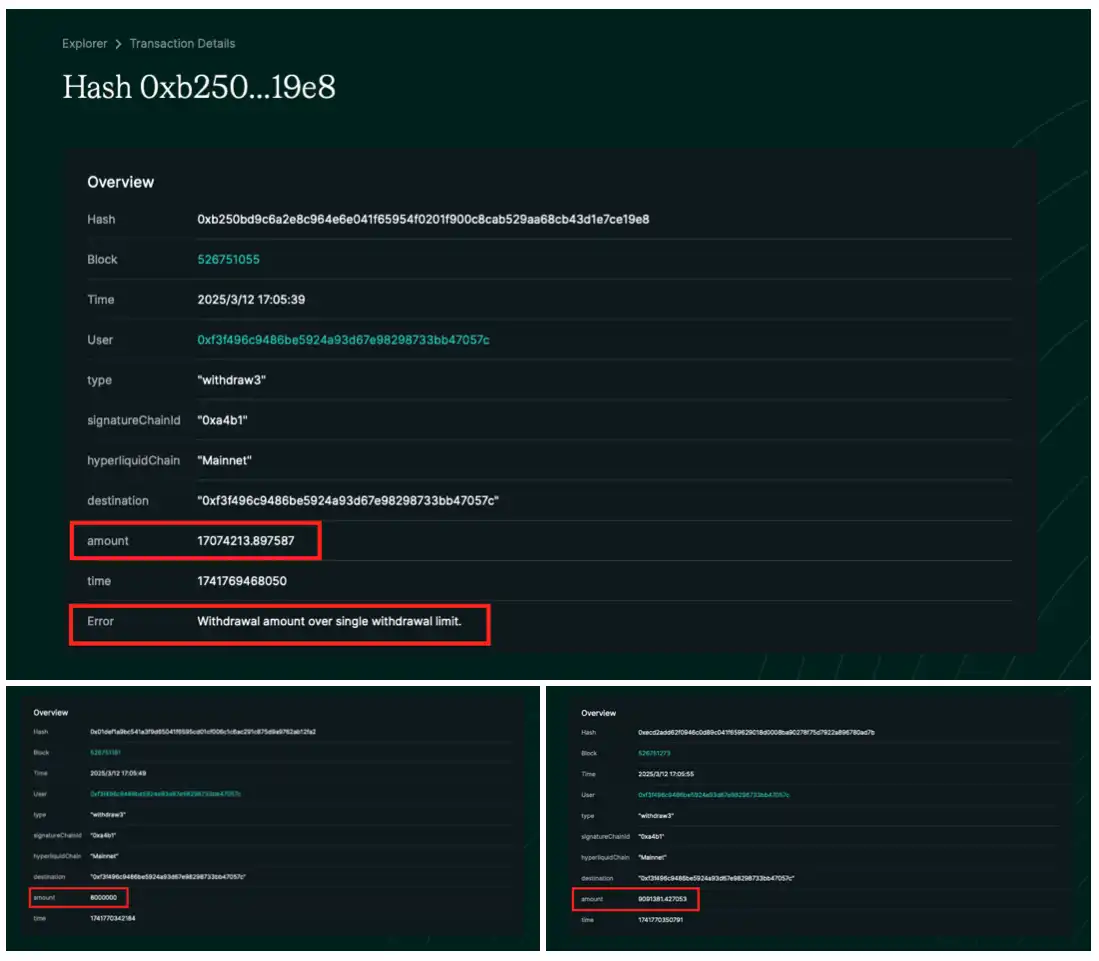 据 Hyper 区块浏览器记录显示,内幕哥在多头仓位未平仓的情况下,连续在 17:05 分进行了三次提现尝试。第一次提现并未成功,前端显示「提款金额超出单笔上限」,内幕哥随后分 800 万美元和 900 万美元两笔交易将总额超 1700 万美元的 USDC 进行提现。