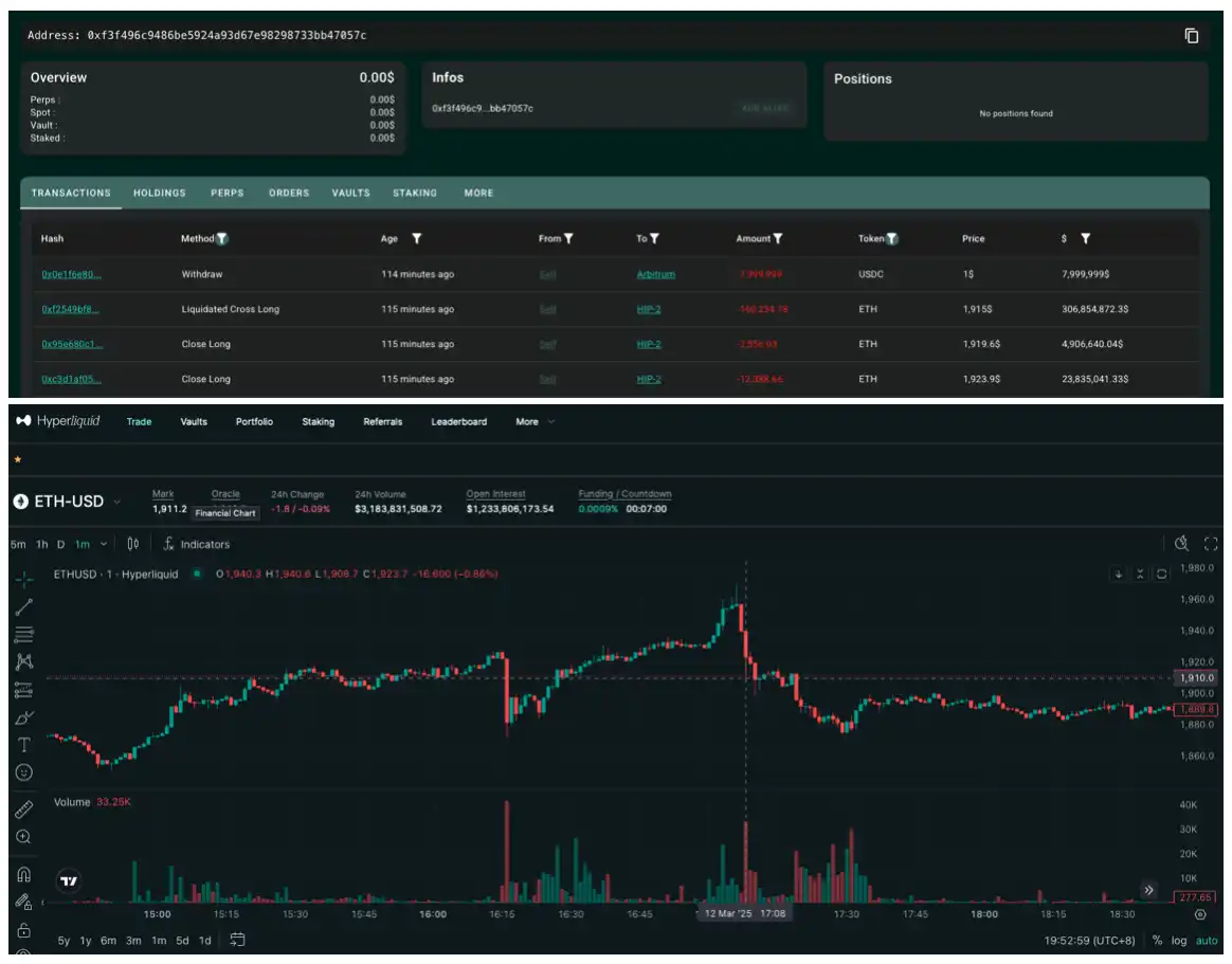 据 Hyperscan 信息显示,内幕哥在 17:08 分连续做出三个操作:平仓、平仓、被清算,随后将约 800 万美元 USDC 提走。ETH 价格也因这位合约巨鲸的平仓急剧下挫,短短 5 分钟内便从 1,970 美元下跌至 1,910 美元附近。