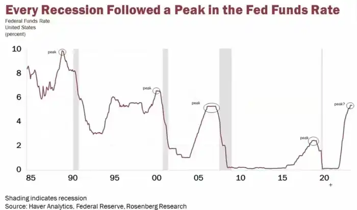自 20 世纪 80 年代以来,每次美国经济衰退都发生在联邦基金利率达到峰值之后。当经济增长停滞时,美联储会通过「刺激」经济来应对。这就意味着通过降低利率的方式来降低资本成本并促进消费。