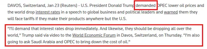 1 月 25 日,特朗普总统声称自己有解决美联储长达 3 年以上抗击通胀斗争的办法。他要求石油输出国组织(OPEC)降低油价,并呼吁全球下调利率。