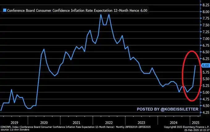 美国消费者认为,未来 12 个月通胀率将上升至+6.0%,这是自 2023 年 5 月以来的最高水平。这标志着通胀预期连续第三个月上升。