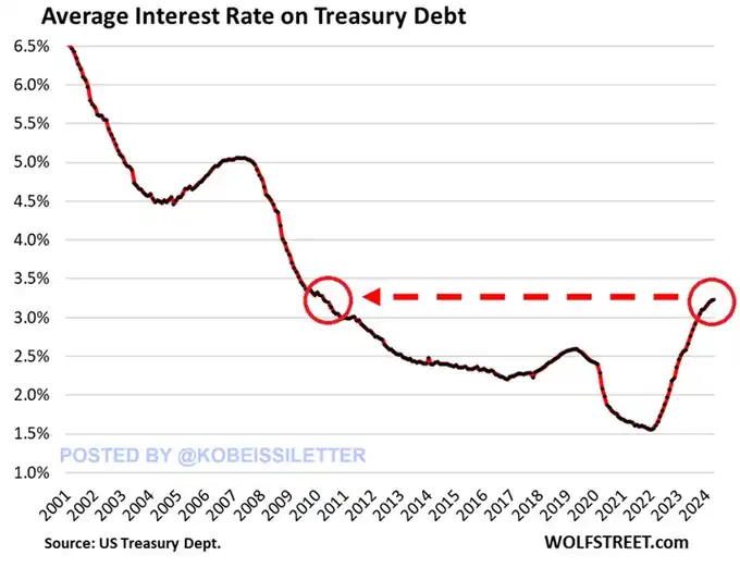 随着利率的飙升,债务利息成本大幅增加。目前,美国 36.2 万亿美元国债的平均利率为 3.2%,打到了自 2010 年以来的最高水平。美国政府比任何人都更需要降息。