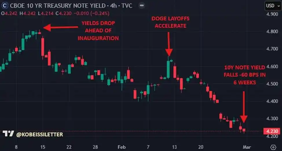 在过去的两个月里,10 年期国债收益率下降了约 60 个基点。这部分是由于市场预期将削减政府效率部门的赤字支出。但同时,这也与不确定性增加以及美国经济衰退可能性上升有关。