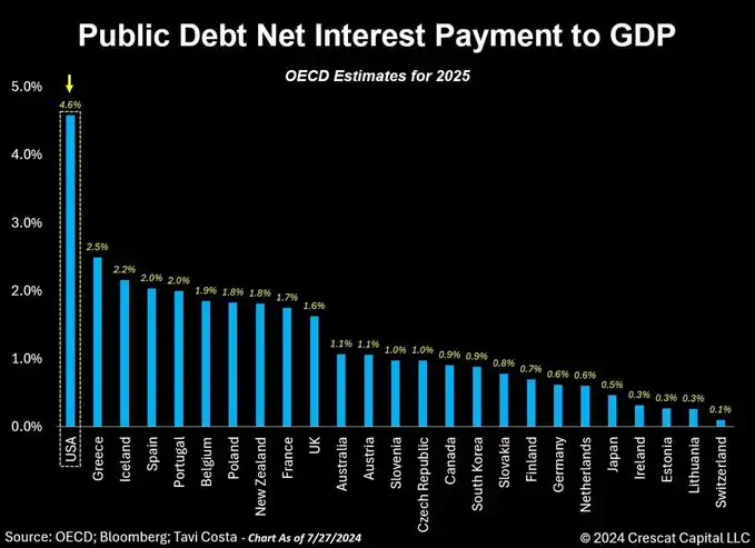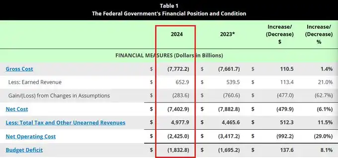 在 2024 财年,美国的支出高达 7.8 万亿美元,而收入仅为约 5.0 万亿美元。这意味着,美国每产生 1 美元的收入,就有 1.56 美元的成本。债务危机的阴云将会笼罩美国很久才会消散。