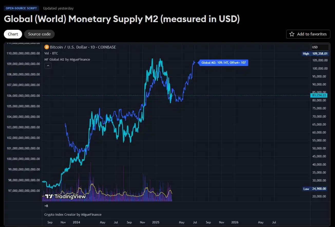2025 年初,全球 M2 由于美联储、欧洲央行等的协调宽松政策而稳步上升。这种扩张,由低利率和债券购买推动,反映了比特币作为法币贬值对冲工具出现的环境。