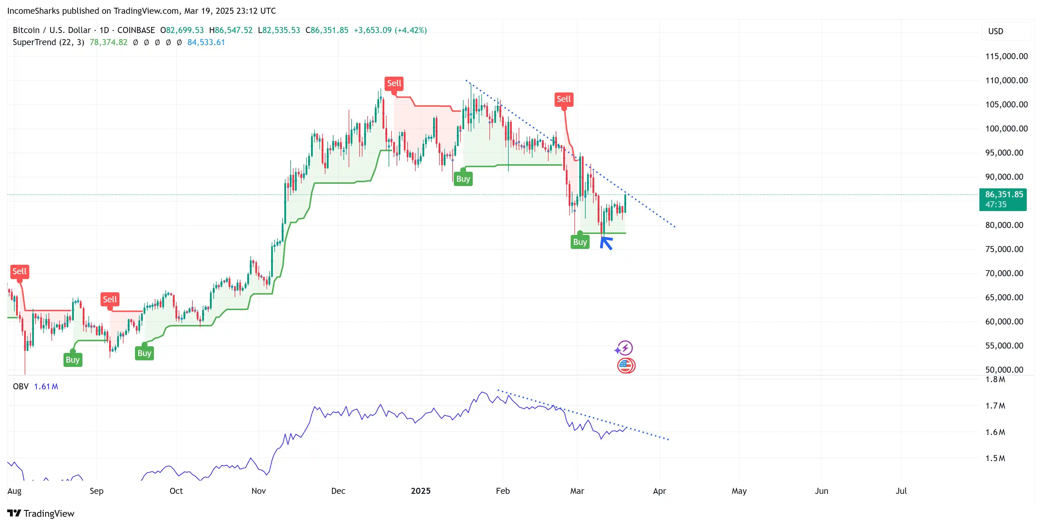 市场分析员「IncomeSharks」认为比特币在超级趋势支撑位反弹,仍然保持买入信号。回头看 BTC 在 OBV「On-Balance Volume」阻力位和对角阻力位的表现,箭头处的跟进是一个明显的强势看涨信号。