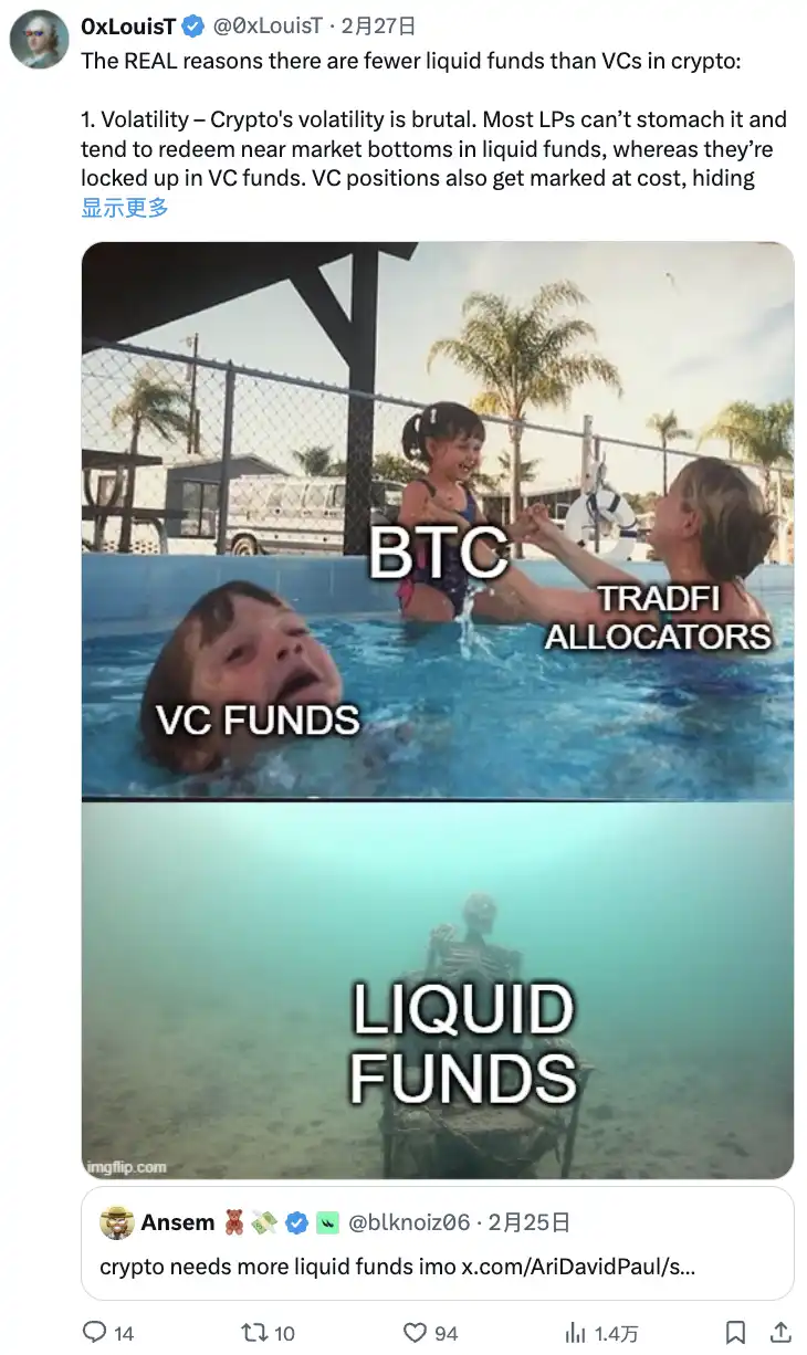 通常,处于「风投狂热」区域表明流动市场的风险调整回报优于风投。「风投投降」区域则更复杂——可能意味着风投投降或流动市场过热。