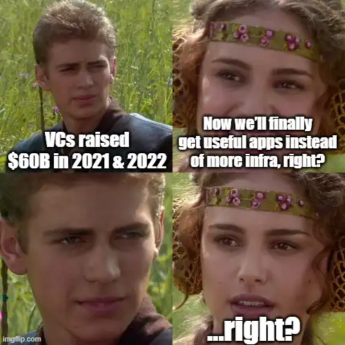 像所有市场一样,加密货币风投和流动市场遵循周期。2021/2022 年的过剩资本正在迅速耗尽,使创始人的募资更加困难。风投现金短缺,对交易和条款变得更加挑剔。