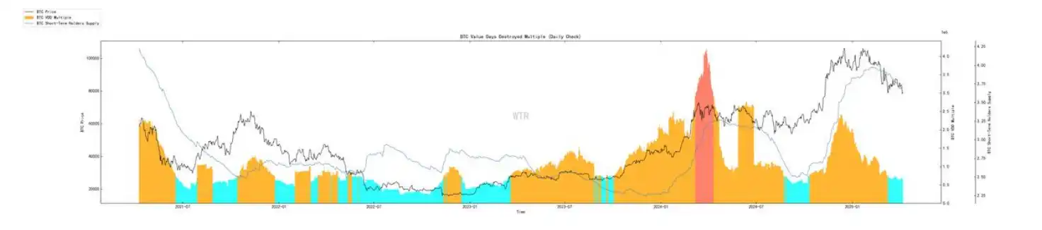 3. ⾼权重持有者已在⾼位兑现利润(VDD),但仍有⼤量短期持有者(STH)处于可能抛售的脆弱状态。