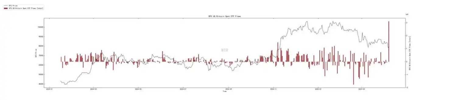 虽然在近期价格下跌期间确实经历了⼀段显著的净流出(负柱),但在图表最右侧(最新数据点)出现了⼀个⾮常⼤的单⽇净流⼊(巨⼤的正柱)。