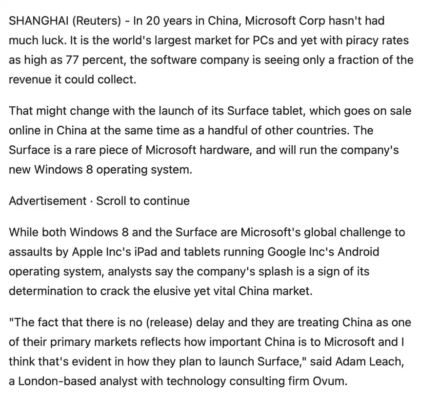 从一开始,我们就遇到了一连串复杂的问题。早期的某个版本的 Windows 甚至被全面禁售,只因为部分本地化工作是在台湾完成的。而这还只是个开始。我们一次又一次地做出真诚的回应:建立了庞大的本地开发团队,开发了广受欢迎的输入法编辑器(Input Method Editor),建设了先进的研发中心,并且严格遵守在中国开展业务的所有规定——甚至在我们的办公室里雇用了本地人员作为中共代表。