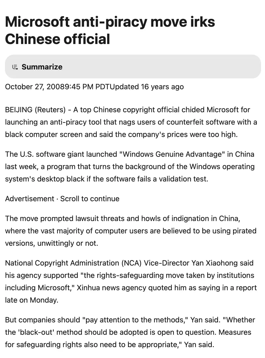 盗版是最明显也最令人沮丧的挑战。虽然软件盗版是一个全球性问题,但在中国的规模令人震惊。大约 90% 的微软产品在中国都是盗版。想象一下,一个拥有 2 亿台个人电脑的国家,其带来的收入却和只有四分之一电脑数量、盗版率「仅有」50% 的意大利差不多。