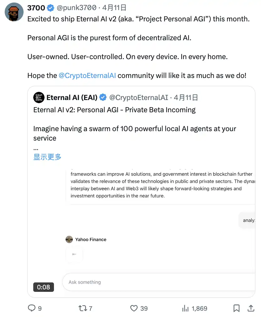 很高兴本月推出 Eternal AI v2(又名「个人 AGI 项目」)。个人 AGI 是去中心化 AI 的最纯粹形式