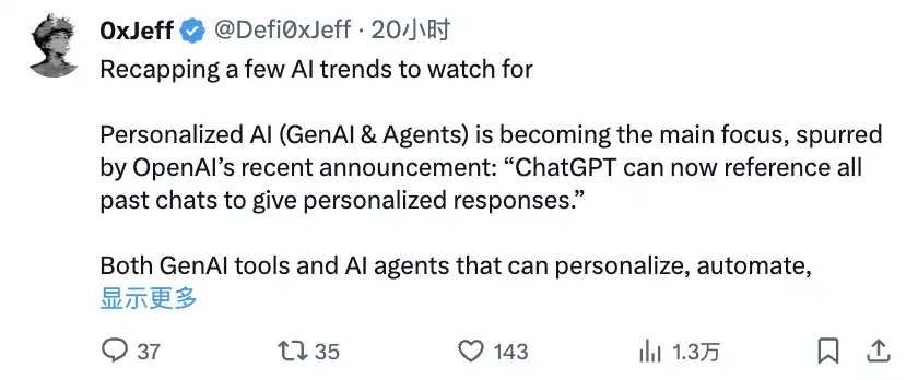 回顾几个值得关注的 AI 趋势 个性化 AI(GenAI & 智能体)正成为主要焦点,OpenAI 最近的声明推动了这一趋势:「ChatGPT 现在可以引用所有历史对话,提供个性化响应。」