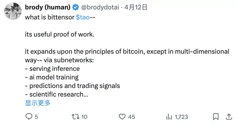 什么是 Bittensor $TAO——它是有用的工作量证明。它扩展了比特币的原则,但以多维方式——通过子网络:提供推理服务、AI 模型训练、预测和交易信号、科学研究、AI 驱动的 DeFi
