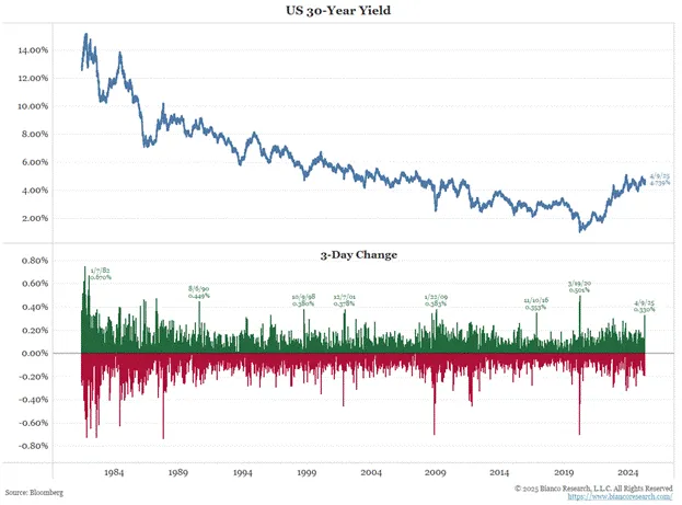 来自 Bianco Research,底部显示了 30 年期债券收益率 3 天变化的异常程度。关税恐慌引发的变化程度与 2020 年新冠疫情、2008 年全球金融危机和 1998 年亚洲金融危机等金融危机期间的市场波动相当。这可不是什么好事。