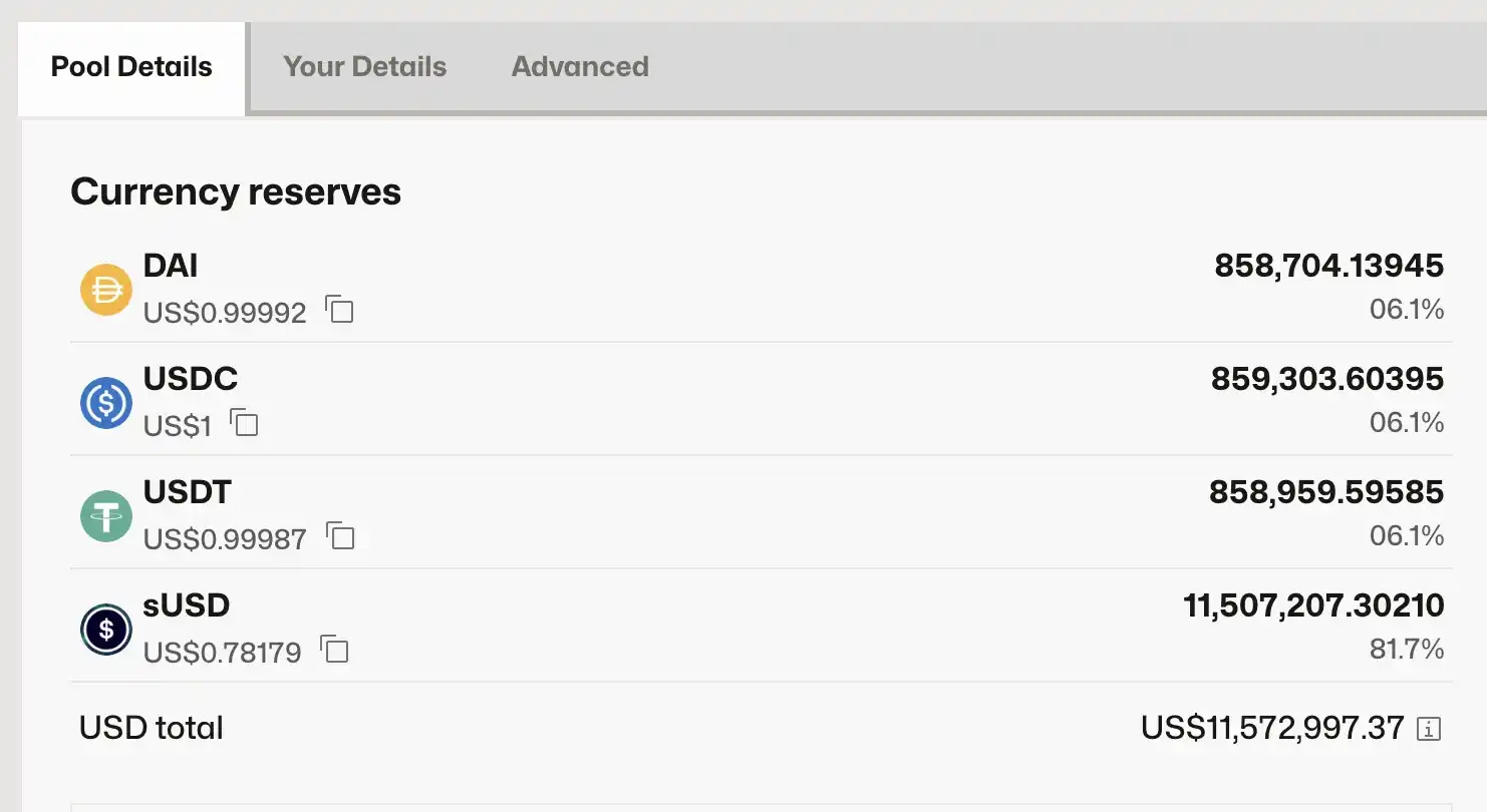 而脱锚情况之所以会逐渐加剧,是因为 sUSD 流动性并没有想象中那么充足。以 Curve 上最大的池子(sUSD/USDC/DAI/USDT)为例,总计约 1151 万美元的流动性中,sUSD 池内份额占比约 81.7%——这意味着实际的退出流动性已在脱锚过程被大量消耗。